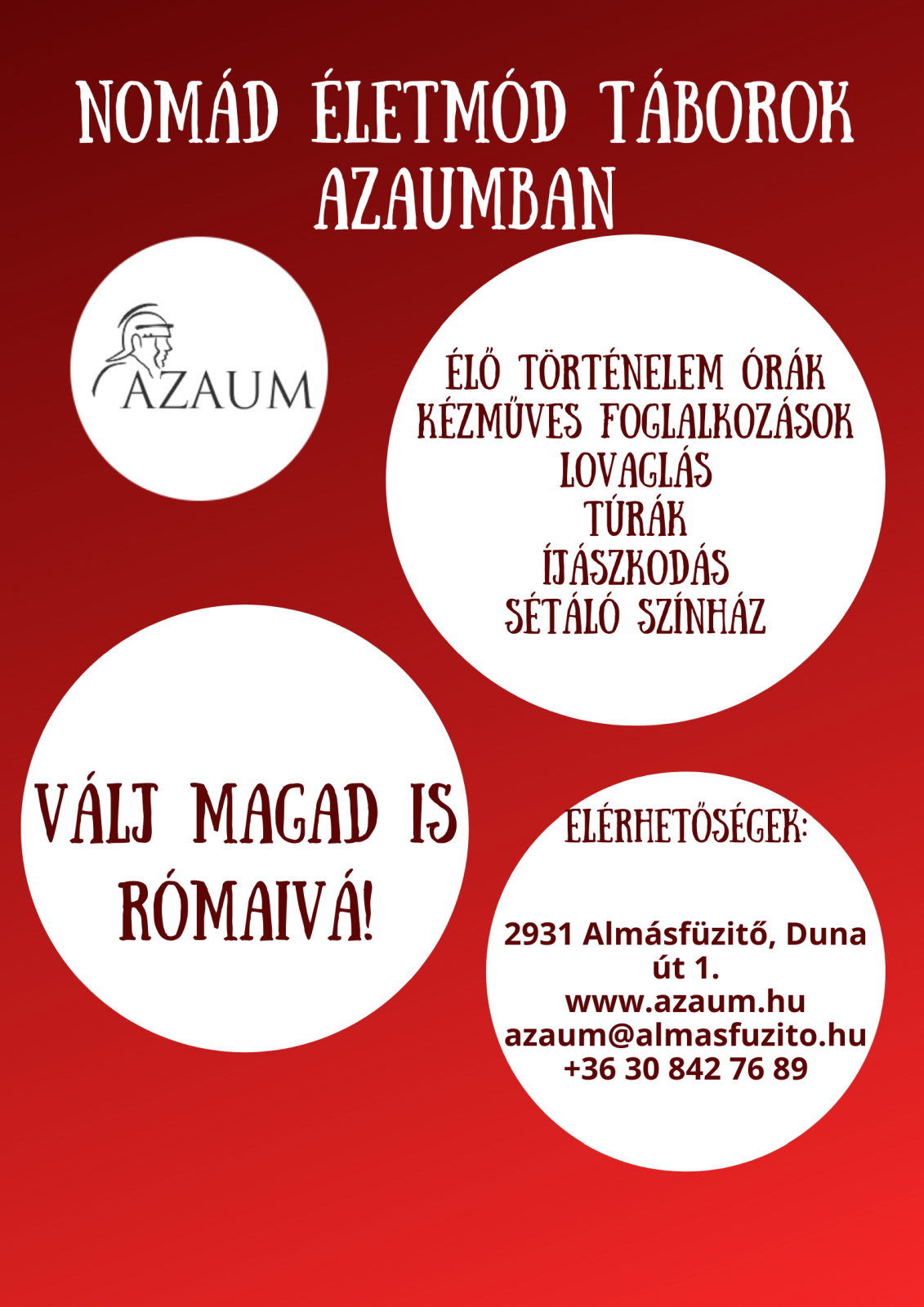 Nyári ötnapos táborainkba nagy óvodásokat és kisiskolásokat várunk. A gyerekek minden nap különböző tematika alapján ismerkedhetnek meg egy-egy történelmi vagy természettudományos témával, amelyet a nap folyamán különböző játékokkal, kézműves foglalkozásokkal, mozgással tesszük élővé. A helyszín adta lehetőségeket kihasználva élő történelemóra keretében ismerkedhetnek a római korral, a katonák életével, részt vesznek korabeli kézműves foglalkozásokon, csapatversenyeken, játékokon, kellő teret adva a személyes kifejezésmódnak is. A program része lehet a fő tematikától függően a kirándulás (közeli Brigetio régészeti ásatás), tánc, zene, ebéd utáni mese az őrtoronyban, légiós kiképzés, lovalás, íjászat. A gyermekek beszélgetnek a gasztronómiáról, zöldségeket, fűszereket és gyógynövényeket kóstolhatnak, illetve kalácsot süthetnek.